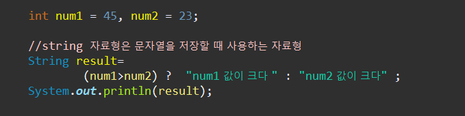- 3항 연산자 : 3개의 항을 대상으로 연산을 수행. 간단한 조건문 대신에 사용할 수 있는 연산자.