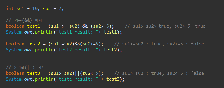 - 논리곱(&&) : 주어진 조건이 모두 참일 때 결과가 true가 됨.