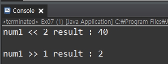 - 비트를 대상으로 왼쪽 / 오른쪽으로 비트를 밀어서 연산을 수행하는 연산자.